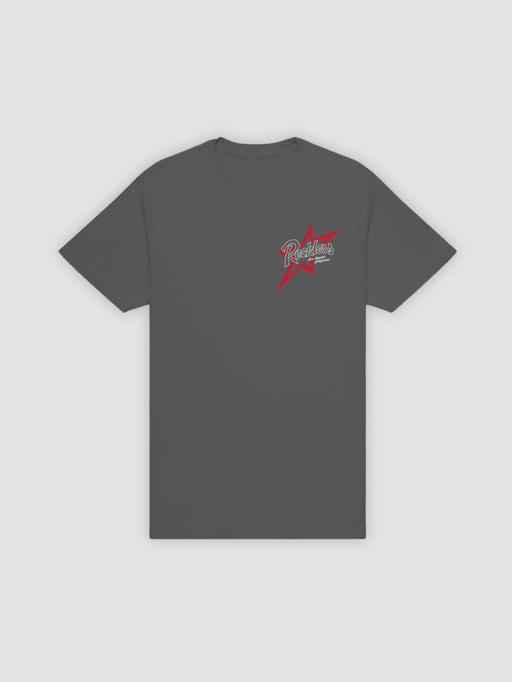 Our Bandit Tee in Charcoal features our RECKLESS logo on the front with a large graphic across the back.Â