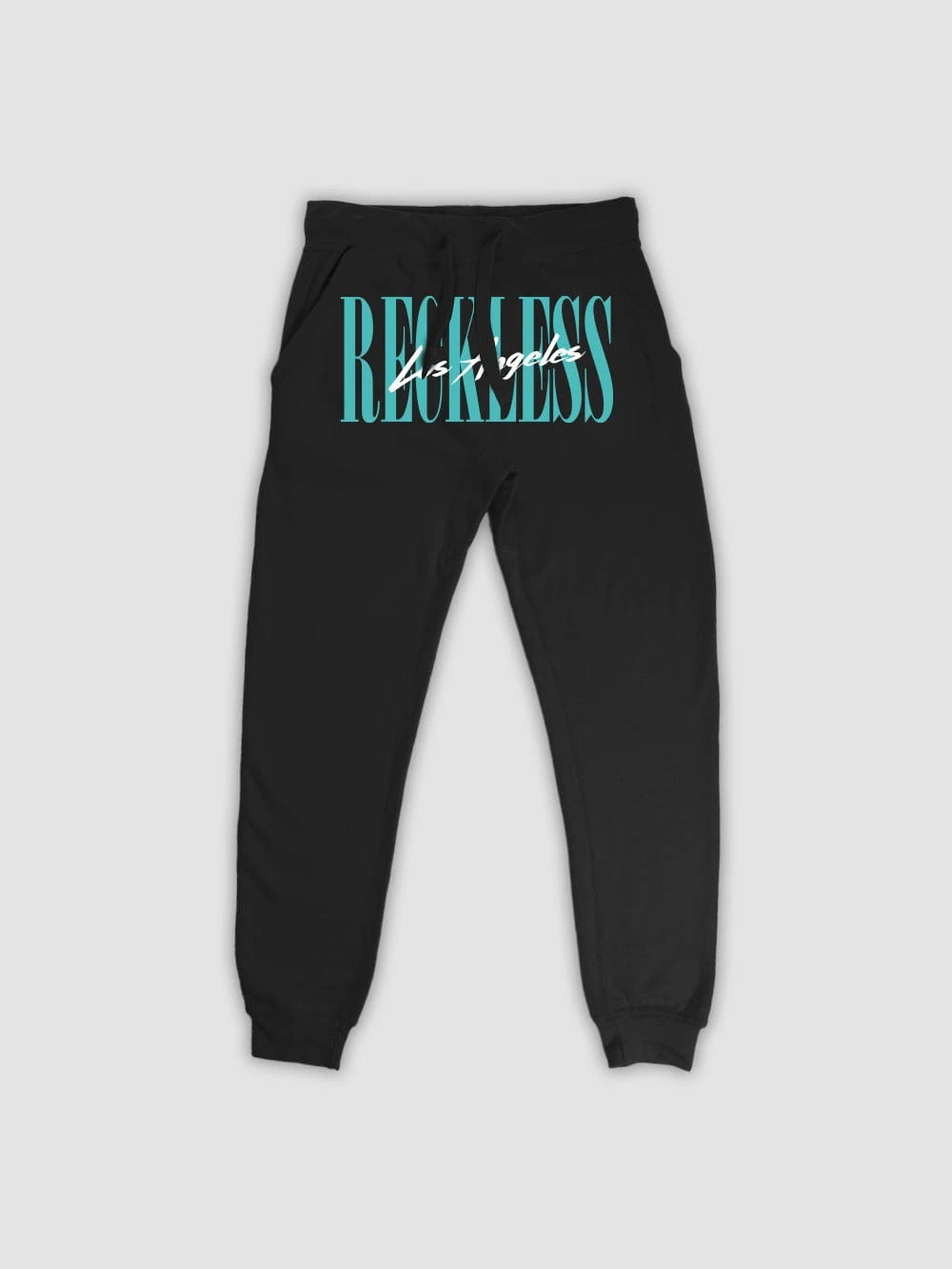 - Step out in our LA Vintage Sweatpants! All-black color is finished with RECKLESS logos on the front and right pant leg in a mint color. The athletic silhouette comes with rib-knit banding at the hem and an elastic waist with an adjustable drawstring. Â