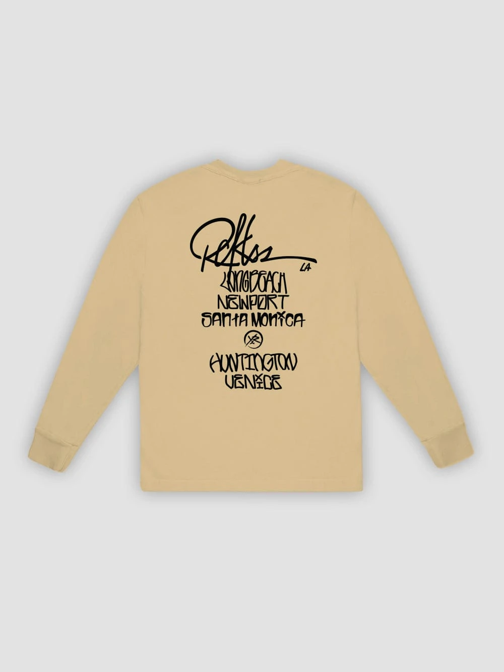 Our Locations Long Sleeve Tee in Sand features our RECKLESS logo across the front and large graphic across the back.Â
