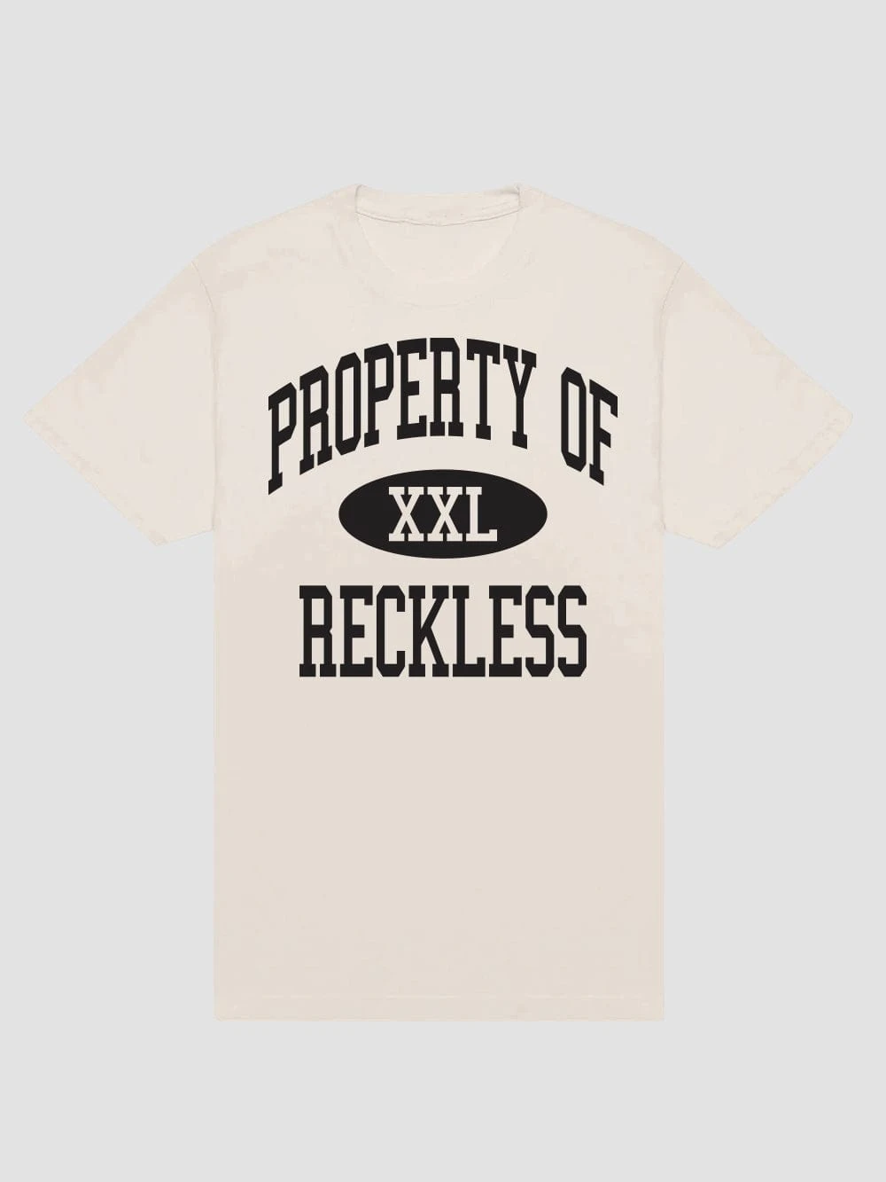 - Introducing our Property tee! Natural toned tee features our “Property of Reckless” logo on the front. Tee is short sleeved, cut to a standard fit, and topped with a rib-knit crew neck.